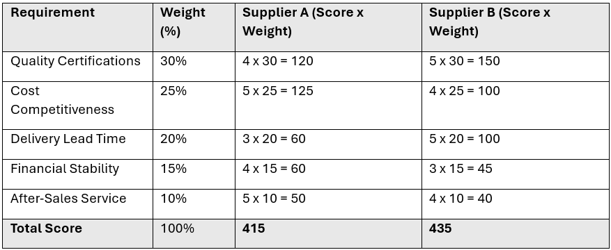 Once requirements are weighted, each team member involved in the evaluation process scores the potential suppliers based on their ability to meet each criterion. Scores can be assigned using a scale (e.g., 1 to 5, with 5 being the best) and then multiplied by the respective weights.